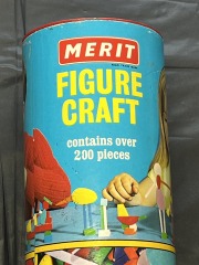 Merit Figure Craft Vintage 1950s Construction Building Toy for Kids. A colourful and fun construction type game, made for Merit by J & L Randall Ltd, Potters Bar, England, and dating to the 1950s. Called Figure Craft, the cardboard tube contains around 200 bright neon plastic pieces, in assorted geometric shapes, with slotted sides which fit together satisfyingly when pushed into place. Recommended age is for 3 years upwards. The cardboard tube has metal lids top and bottom, and shows signs of wear with a few scuffs and surface tears, but is still intact and fully usable. It measures 22.5 cm/8.75" high, and the set weighs 241 gms - estimated packaged weight is 500 gms.