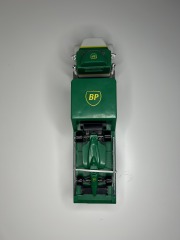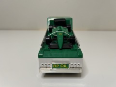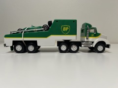 VINTAGE BP TOY RACE CAR CARRIER 1993 Limited Edition Series Formula 1 Style Brand New in Box NIB. The 1993 BP Race Car & Carrier Truck & Trailer Toy is a Limited Edition Series produced by BP. It features a green Ford truck carrying a race car, both made of plastic. The set is unopened and recommended for ages 4 and up. The theme revolves around the BP brand, with the vehicles manufactured in China. #1