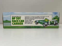 VINTAGE BP TOY RACE CAR CARRIER 1993 Limited Edition Series Formula 1 Style Brand New in Box NIB. The 1993 BP Race Car & Carrier Truck & Trailer Toy is a Limited Edition Series produced by BP. It features a green Ford truck carrying a race car, both made of plastic. The set is unopened and recommended for ages 4 and up. The theme revolves around the BP brand, with the vehicles manufactured in China. #2